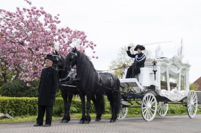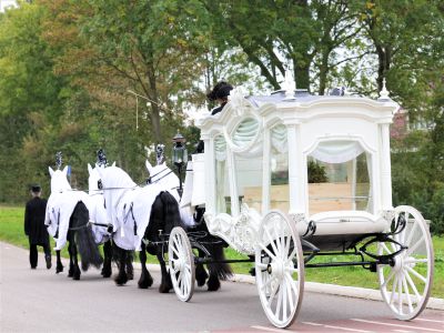 Sinds oktober 2020 hebben wij deze volledig authentiek gerestaureerde witte rouwkoets aan onze collectie mogen toevoegen. Deze witte rouwkoets bevat prachtig houtsnijwerk en is heel mooi gestoffeerd met witte rouwgordijnen en een hemel. De koets heeft hierdoor een extra stijlvolle uitstraling. De koets kan worden getrokken door twee of vier Friese paarden. De uitstekend verzorgde paarden zijn bespannen met prachtige, luxe lakleren gareeltuigen. Indien gewenst kunnen de paarden worden getooid met witte of zwarte kleden, kappen en pluimen. De koetsier en voorloper gaan stijlvol gekleed in zwarte koetsiersjassen met witte tressen. Zij zullen de opdracht stapvoets uitvoeren; bij langere afstanden zal in overleg een deel van de route in draf worden afgelegd. Het rijden met eigen paarden door u of door ons, of het rijden met eigen koetsier is mogelijk.